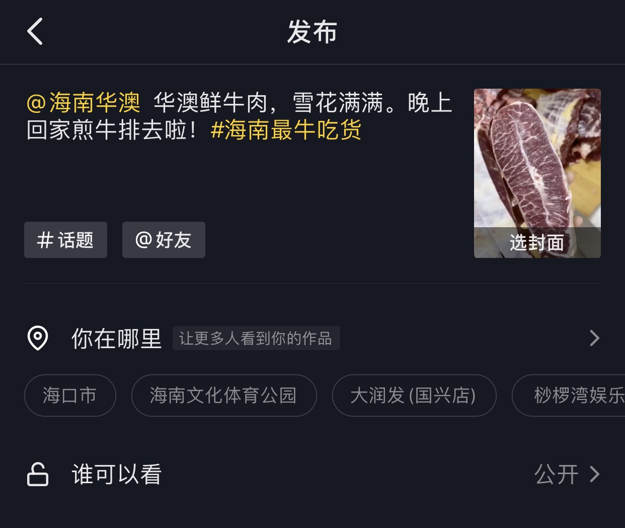 5、上传视频时加入话题#海南最牛吃货,并@海南华澳,即可成功参与活动。
