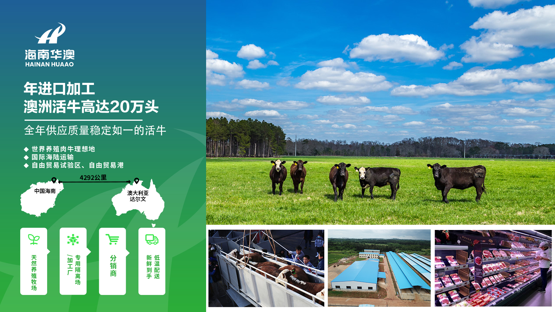 2016年,海南华澳畜牧业股份有限公司启动20万头/年澳洲进口活牛屠宰加工项目。海南华澳是海南唯一具有从澳大利亚进口活牛资质与定点活牛加工资质,将建有500亩具备隔离检疫、屠宰加工为一体的全产业链生产加工基地。从进口活牛到隔离检疫、屠宰加工、精细分割,控温运输,以热鲜为主产品供应市场,为百姓提供平价、高品质肉牛,打破业内以生产国内牛为主以冻品为主的格局。